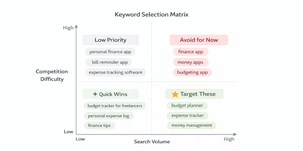 Search volume shouldn't be the only criterion for keyword selection. High-volume keywords come with high competition. Mid-volume but more specific long-tail keywords offer much more realistic targets for small and mid-sized apps. Think "budget tracker for freelancers" rather than "budget app".
