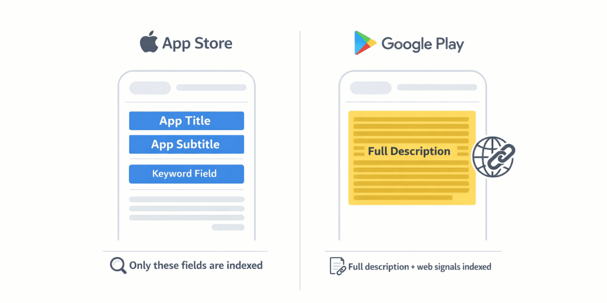 On the App Store, keywords can only be placed in specific fields like the title, subtitle, and a 100-character keyword field. Words outside these areas don't influence the algorithm. Google Play takes a much broader approach and indexes the entire description text. So while a long description barely moves the needle on the App Store, it directly impacts rankings on Google Play.