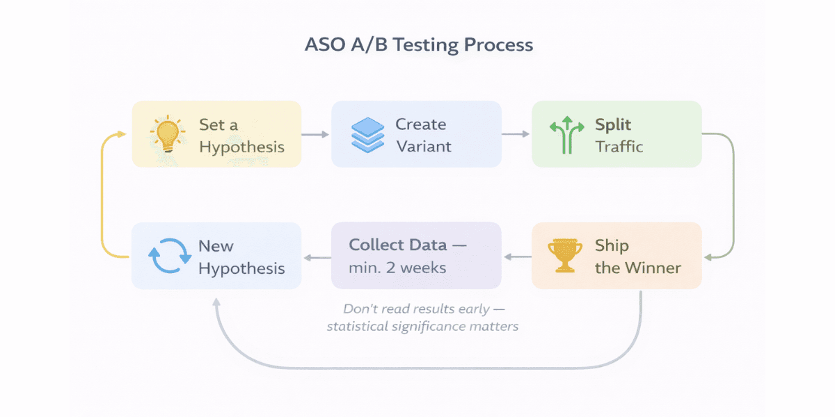 A few practical points for the testing process: test one variable at a time. If you're changing the icon, don't change the screenshots at the same time. Wait at least 2 weeks for results since early readings can be misleading. And always form a hypothesis first, something like "a dark background will drive higher tap-through because the category average skews light".